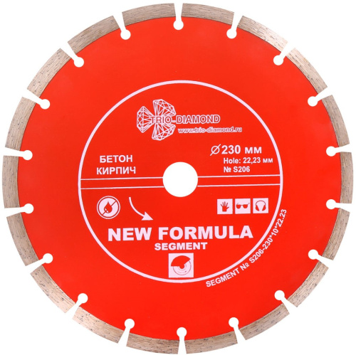 Назначение: бетон, бордюрный камень, шамотный кирпич, кирпич, тротуарная плитка, твердый песчаник. Особенности: сегментные диски - универсальные диски, для широкого спектра строительных работ. Разделение режущей поверхности на сегменты дает возможность отводить отработанный материал и способствует дополнительному охлаждению. Отличительная особенность диска повышенная производительность. Технология производства: Холодное прессование