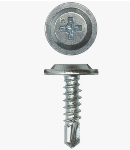 Крепёж представляет собой саморез с напрессованной шайбой, увеличивающей площадь прижима и надёжность фиксации. Оснащён полусферической головкой со шлицем Phillips № 2. Бур на конце позволяет проделывать отверстия в металле без предварительного сверления. Не подходит для потайного монтажа. Изделия, представленные в нашем каталоге, оцинкованы, что делает их устойчивыми к коррозии.
