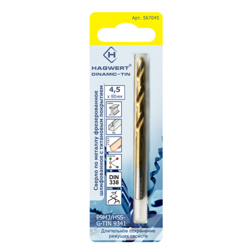 Сверло по металлу 4,5х80мм Dinamic-TIN Р6М5 фрез. Hagwert/Rennbohr /1/2/10/ 567045/667045
