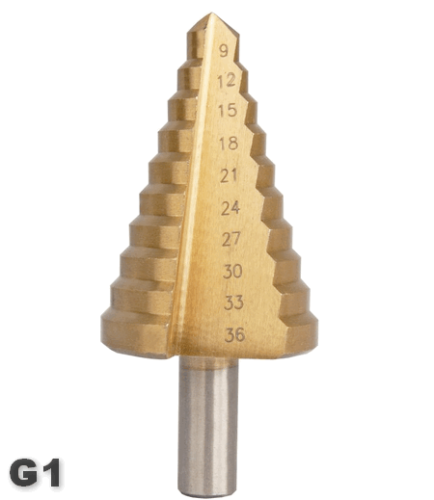 Сверло ступенчатое для цветных металлов G1, СTМ-529 предназначено для сверления отверстий разных диаметров в листовых и тонкостенных изделиях из стали до 4 мм, цветных металлов, нержавеющей стали и пластика. Каждый следующий размер имеет плавный переход в виде ступеньки, что позволяет получать аккуратное отверстие нужного диаметра. Диаметр - от 4-12 до 9-36 мм, Тип - ступенчатое G1-G5.