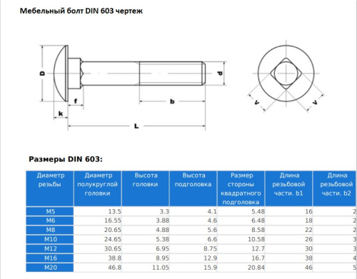 DIN 603 – стандарт, регламентирующий болт мебельный с полукруглой головой. Болт имеет полукруглую головку, квадратный подголовник и резьбовой стержень (с полной и неполной метрической резьбой). Особенностью болта мебельного DIN 603 является его конструкция, которая позволяет легко и быстро соединять детали мебели без необходимости использования специальных инструментов.