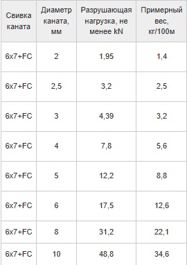 Конструкция каната: 6x7+ FC. (первая цифра – число прядей троса, вторая – число проволок в пряди, буквы – материал сердечника: FC – волокнистые материалы).